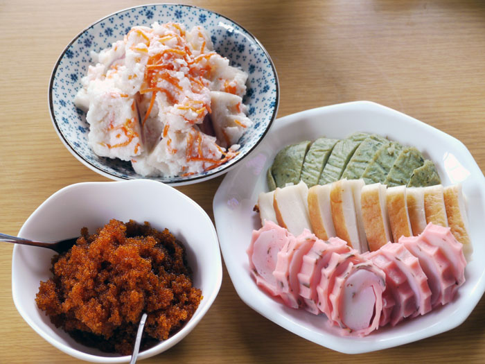 右 上から「よもぎ入り蒲鉾」「ふつうの蒲鉾」「さくら入り蒲鉾」