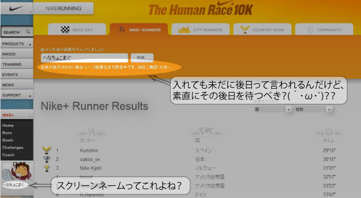THE HUMAN RACE 10Kでの自分の順位を確認すべく、