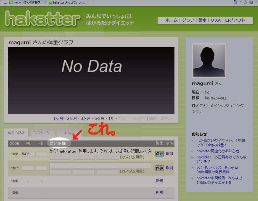 で、今朝の体重を入力しようと、編集画面を開いたら…
