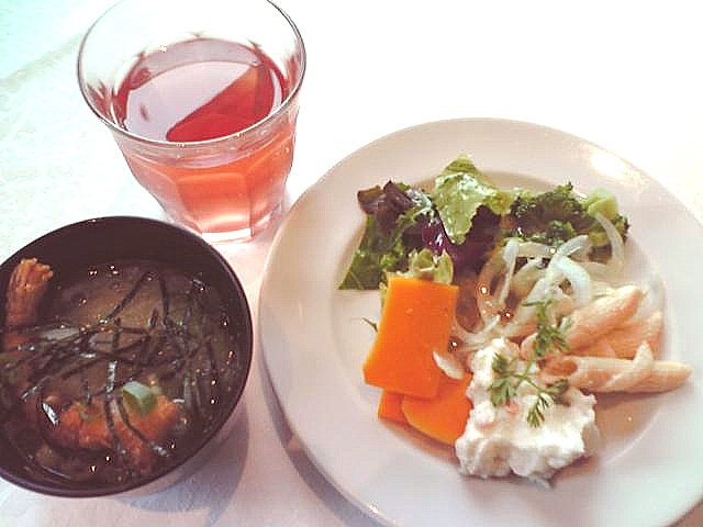 サラダの生野菜、新鮮だなぁ。だいだいの四角いのはかぼちゃ。