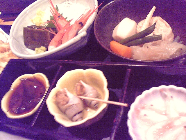 左上のお刺身の小鉢には、ほんとに甘い「甘えび」と「昆布じめ」。