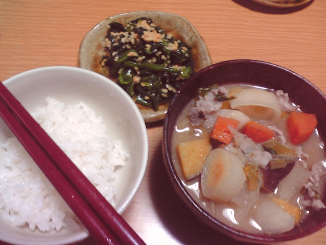 豚汁、ホウレンソウのひきわり納豆和え、ごはん。