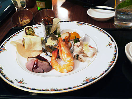 一番上のガラスの器に入っているのがピータンとフカヒレのお刺身。